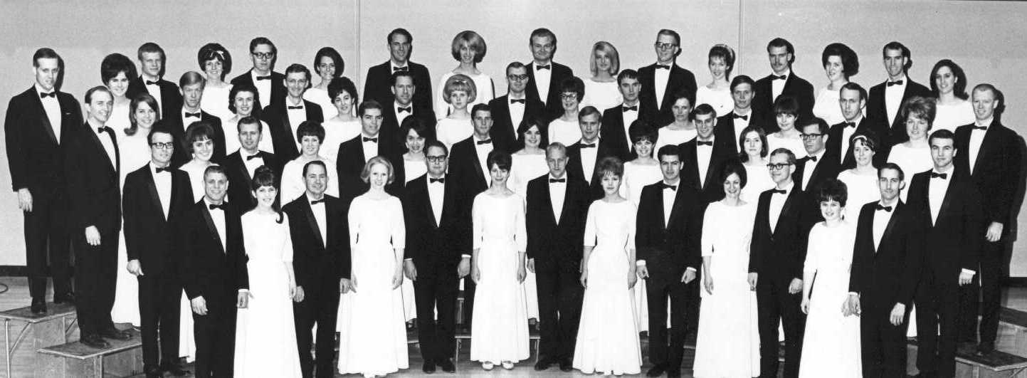 This picture was issued by BYU in anticipation of the European tour which, at the last minute, had to be postponed to the following year. The caption issued with the picture stated: "The 1967 A Cappella Choir from Brigham Young University, Provo, Utah. Currently making a tour of Europe. These noted collegian singers have been rated as 'among the best in the U.S.A.' by a national convention of music educators. They are directed by Dr. Ralph Wooward."